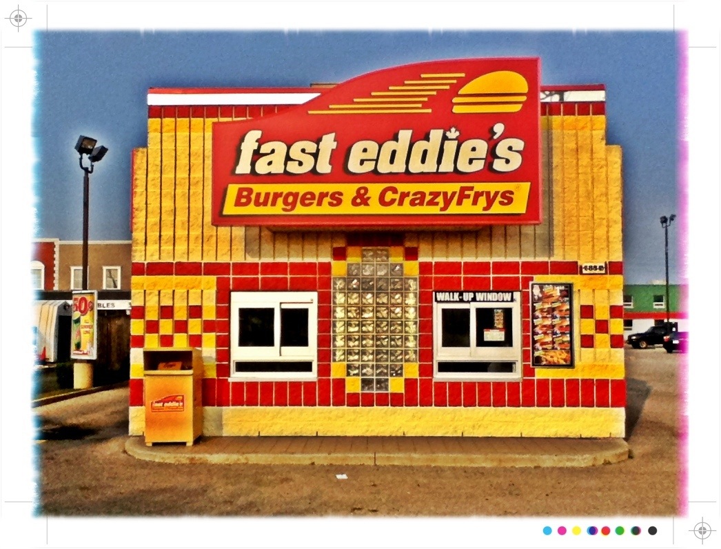 For me it is a diorama, a sliver of a dying car culture — frozen in time. Fast Eddie’s restaurant, a local burger chain with a self conscious branding, is a cultural icon on the strip. Its blistering yellow and red/orange concrete blocks rise from the landscape like a Lego pimple.